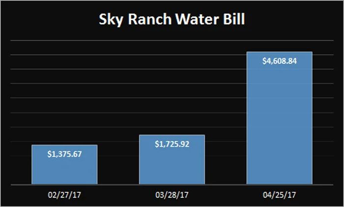 Sky Ranch Water Bills June 11, 2017 by Sky Ranch Santee When a report is made that a 2” irrigation line is running 11 hrs every day, a faster response would save money.