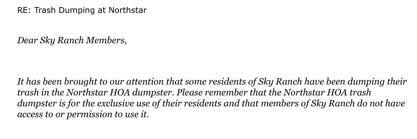 This message was sent to Sky Ranch for Northstar. Sky Ranch residents reportedly are using the trash dumpster at Northstar. On the other hand, Northstar residents are storing their vehicles in Sky Ranch every day.