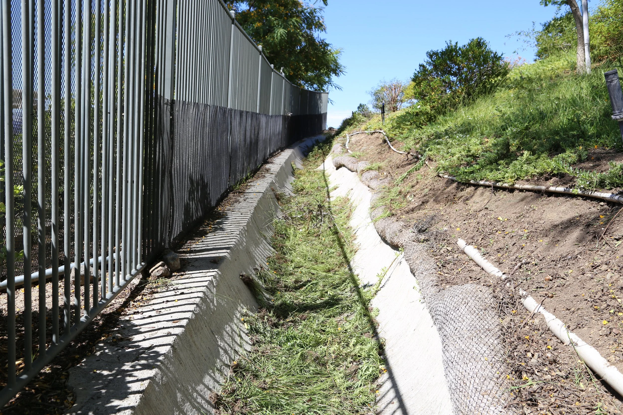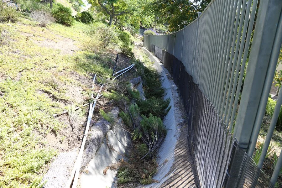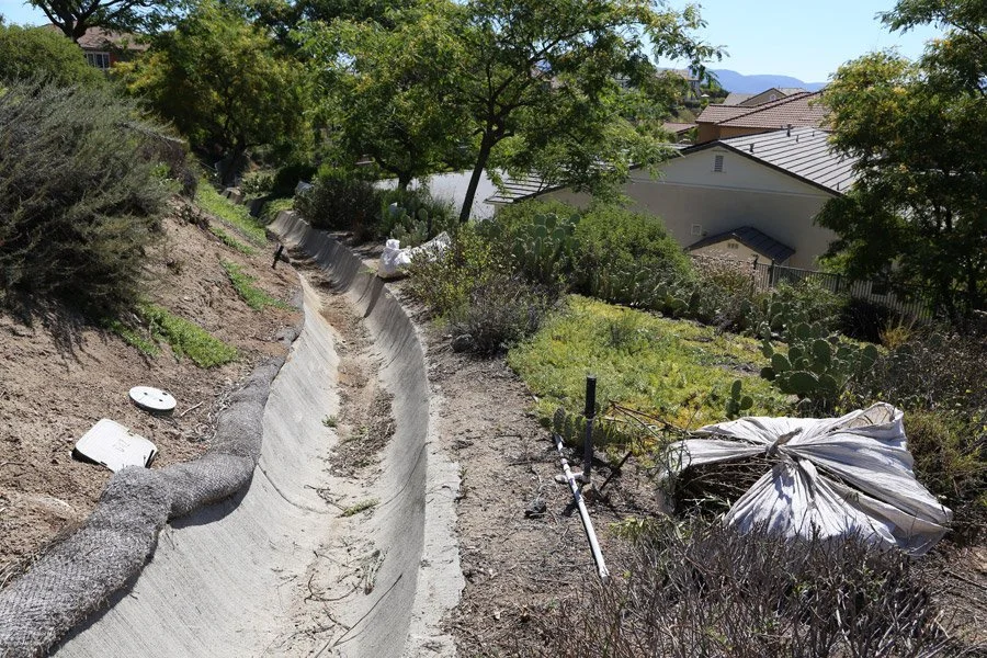 Ditch filled with debris is a fire danger. Photo taken the day after the string trimming video.
