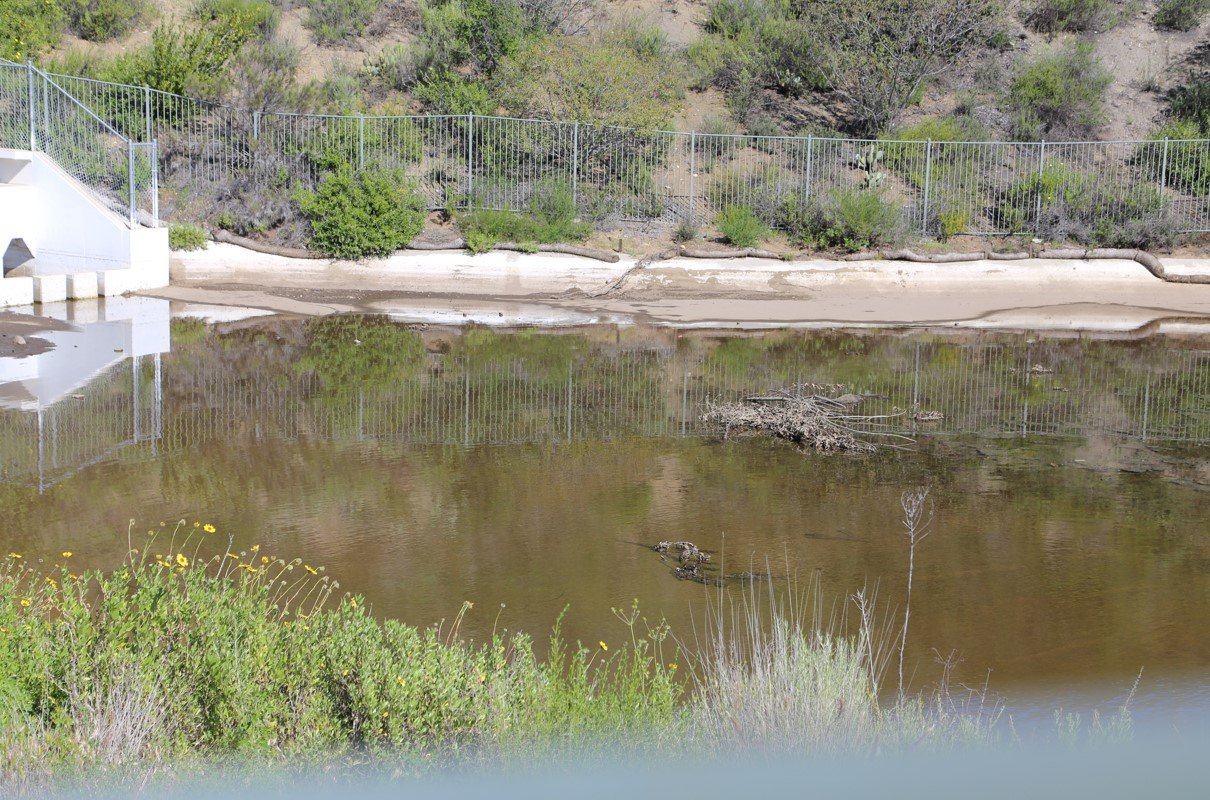 Sky Ranch detention basin: clog, waterline shows overflow, branches sticking out